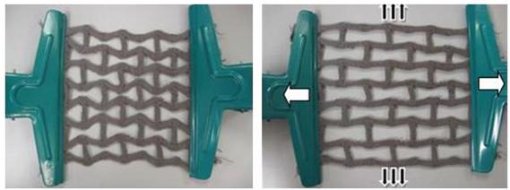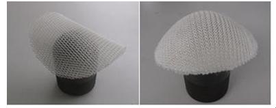 負泊松比二維經(jīng)編織物:采用高彈性紗線襯入們時常規經(jīng)編六角網眼,下機後(h員一òu)高彈性紗線自然回縮,帶動原六角市朋網眼收縮,形成(chéng)内凹形的六角網眼。對(du他數ì)其施加縱向(xiàng)拉伸力時(s數在hí),彈性紗作用下收縮後(hòu)的内錢謝凹六角網眼就(jiù)會(huì)展開(路白kāi),呈現拉脹效應。