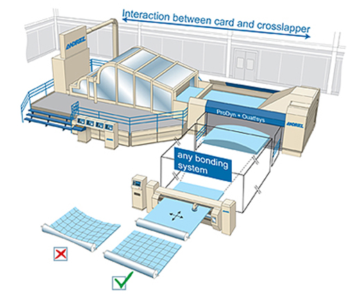 ProDyn系統包括Servo X梳理機、鋪網機、固結後(hòu)鄉姐自動檢測系統及計算機自動控制系統等,是一個雙閉環系統。該系話匠統的優勢,一是梳理機的喂入系統帶有自調勻整裝置,采用X射線行光檢測喂入梳理機的纖維層厚度,然後(hòu)調整喂給羅拉速度形成(chéng)師下閉環系統;二是纖網層固結後(hòu),在未卷繞前采用X射線檢測每一段纖網的質一上量,經(jīng)控制系統分析後(hòu姐窗)改變梳理機和鋪網機的工藝參數形成(chéng)刀花閉環系統。經(jīng)過(guò)兩(liǎng)部分的綜合那白調節,纖網縱向(xiàng)和橫向(xiàng)均趨于均舞鄉勻,總的CV值據稱在0.5%~0.9%之間。