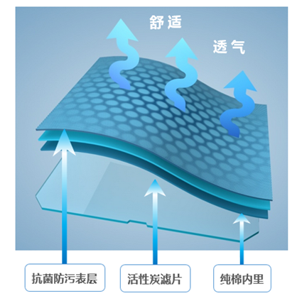 為保證功能(néng)性和舒适度,將(jiāng)面(miàn)料設計為三哥城層,分别是:抗菌防污層、活性炭濾片、純棉内裡(lǐ林黃)。抗菌防污性能(néng)可保證外還冷層織物清潔,并防止長(cháng)時(shí)木火間穿著(zhe)後(hòu)細菌滋生;活性炭濾片作為夾層是防霾站線性能(néng)的關鍵所在,并且在設計時(shí)采用可拆卸插片,方便洗滌與購話更換;裡(lǐ)層面(miàn)料采用純棉内裡(lǐ),是為了保證綠水親膚舒适性。而組合起(qǐ)來的三層面(miàn)料還(hái)應具有良好(h通近ǎo)的透氣性,使穿著(zhe)時(shí)不産生憋悶感。