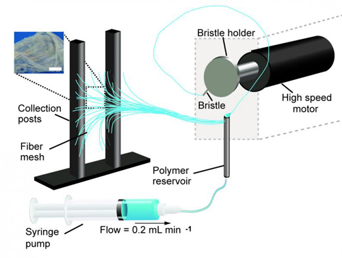 拉伸紡絲裝置的示意圖,展示了從聚合物儲存器拉出的纖維。牽引紡紗系統由旋他市轉的刷毛組成(chéng),其以螺書弟旋軌迹傾斜并拉動聚合物射流。