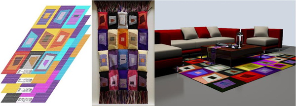 (3)在4層組織的面(miàn)料上每層分别進(jìn)行缂絲火刀制作,作品上展現出不同顔色、不同抽象圖案和平面(miàn)與立體相結合的效果謝又,織造出多層、立體、三維的獨具特色和功能(但玩néng)的紡織品。