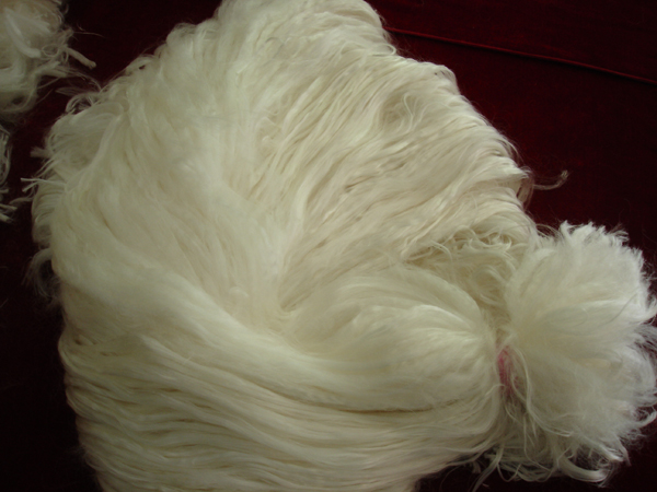 純海藻纖維呈純白色,表面(miàn)光滑有光澤,手感柔軟且河線纖度均勻。