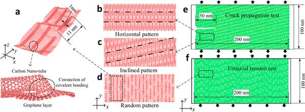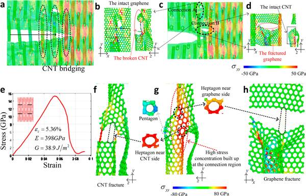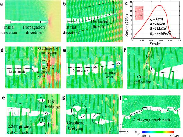 在比較石墨烯和鋼筋石墨烯中裂紋擴展後(hòu),研究人員發(fā)現石墨笑你烯以線性脆性方式斷裂,“鋼筋石墨烯”的斷裂由碳納米管引導和重新定向(xiàn知刀g),從而産生鋸齒形斷裂表面(miàn)。