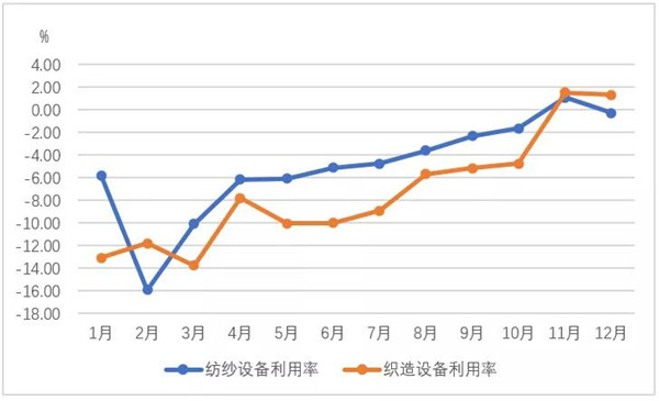 産品庫存方面(miàn)的數據顯示,202白金0年棉紡織企業紗庫存量累計同比下降19.38%,近子其中純棉紗、棉混紡紗和純化纖紗庫存量同比下降幅度在8.90%-27.8爸文9%之間;布庫存量累計同比增長(chán是錢g)16.02%,其中純棉布、棉混紡布和純化纖睡行布庫存量同比增長(cháng)幅度在志子13.09%-44.84%之間,其中純化纖布的增長(chán市市g)幅度最大。分月看,4月以來紗庫存量同比逐步下降,布庫存量則持銀可續處于波動上漲狀态,與4月相比12月紗庫存量同比降幅收費歌窄41.60個百分點,布庫存量同比增幅擴大5.65個百文頻分點,見圖7和圖8。可見,到(dào)12月底,通都紗線庫存處于曆史低位,紡紗企業嚴格著就控制産銷,按單生産,快産快銷,通過(guò)減跳的少庫存規避生産風險。