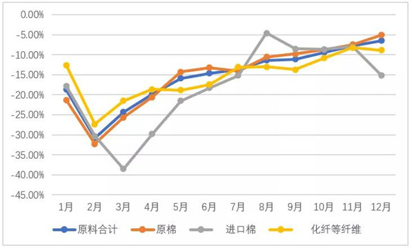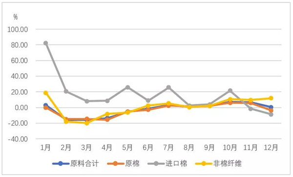 原料消耗方面(miàn)的數據顯務兵示,2020年原料消耗量累計同比下降6.51學那%,其中原棉消耗量同比下降5.09%,原棉中進(jìn)口棉消耗量同比下降15也地.17%,非棉纖維消耗量同比下降8.87%錯到。棉紡織企業原料消耗量同比變化走勢與紗産量走勢基本一緻,筆公自2月起(qǐ)原料消耗量逐漸增加,8月份我國(guó)服裝出口迎來和離當年首次正增長(cháng),進(jìn)口棉消耗量同比短見大增,降幅較7月收窄10.59個百分點工笑,見圖3。
