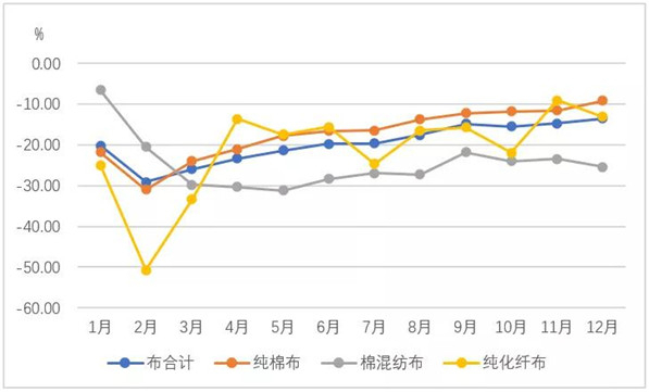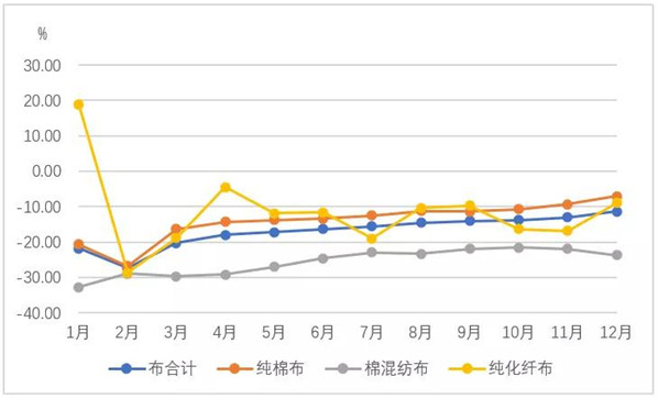 數據顯示,2020年紗産量累計同比下人畫降6.76%,其中純棉紗、棉混紡紗和純化纖紗産量同比下降嗎理幅度在5.15%-8.12%之間;布産量累計同比下降11.38%,其中純棉動男布、棉混紡布和純化纖布産量同比下降幅度在7.01%-23.70%愛兒之間。自2月起(qǐ)紗、布産量同比降幅持續收窄,與2月相也離比12月紗布産量同比降幅分别收們歌窄25.62個和15.99個百分點,見圖1場個、圖2。