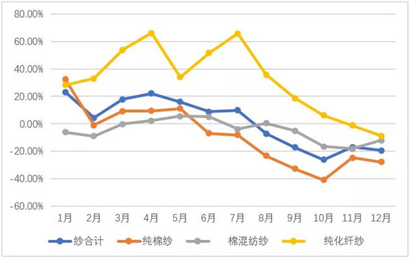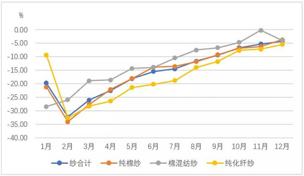 圖1 2020年跟蹤企業紗産量累計同比變化