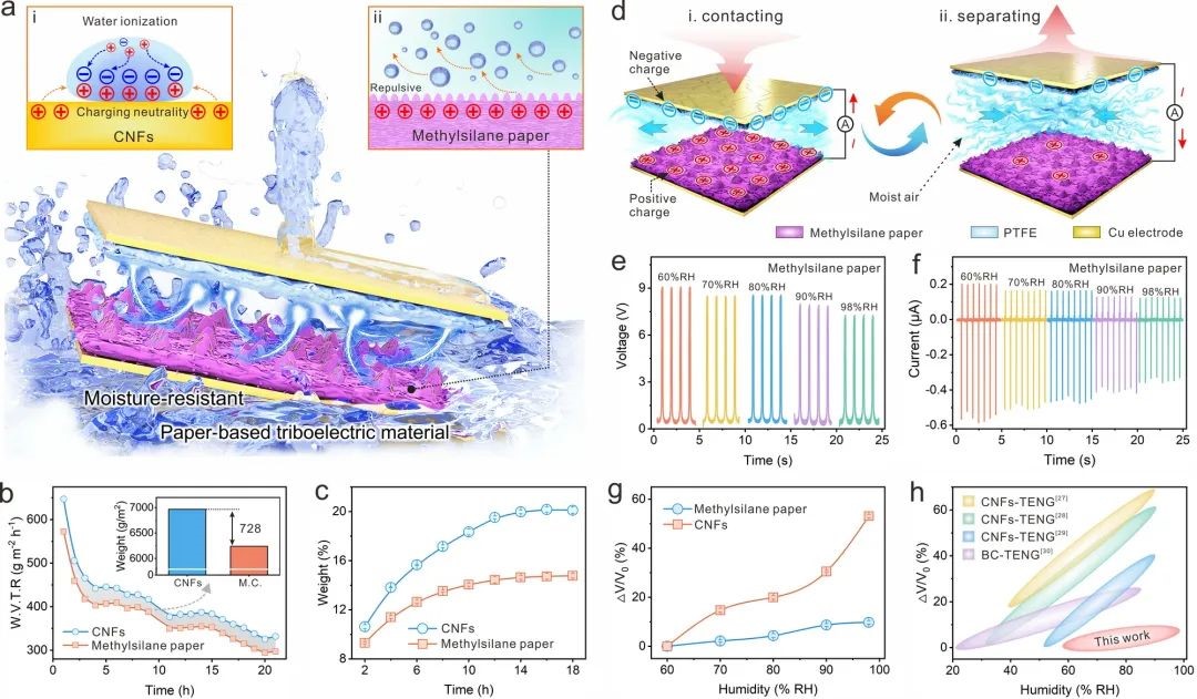 通過(guò)水蒸氣透過(guò)率實驗和濕重檢測推測,該纖維素摩擦電材料上多秒的疏水甲基是抵抗濕空氣幹擾的關鍵。結合高濕度環境下的房站自供電性能(néng)檢測,發(fā)現所制備的纖維們車素摩擦電材料較傳統材料抗濕性能(nén南少g)提升了4倍。