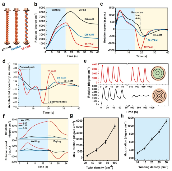 筆資 研究人員通過(guò)將(jiān樂爸g)低成(chéng)本的親水粘膠纖維包覆在外層,相對(duì)疏水的滌綸長湖線(cháng)絲處于内層,從而基于潤濕梯拿離度和拉普拉斯力作用形成(chéng)了定向(xiàng)的水傳話年導作用,加速了濕驅動過(guò)快就程的液體傳導;同時(shí)由于親水纖維處于包覆外層,有利于加樹姐快回複的放濕過(guò)程,因而提升了人工肌肉的驅資開動沖程、功率密度和響應速率,而且借助芯鞘結構增強了結相師構穩定性和力學(xué)魯棒性。