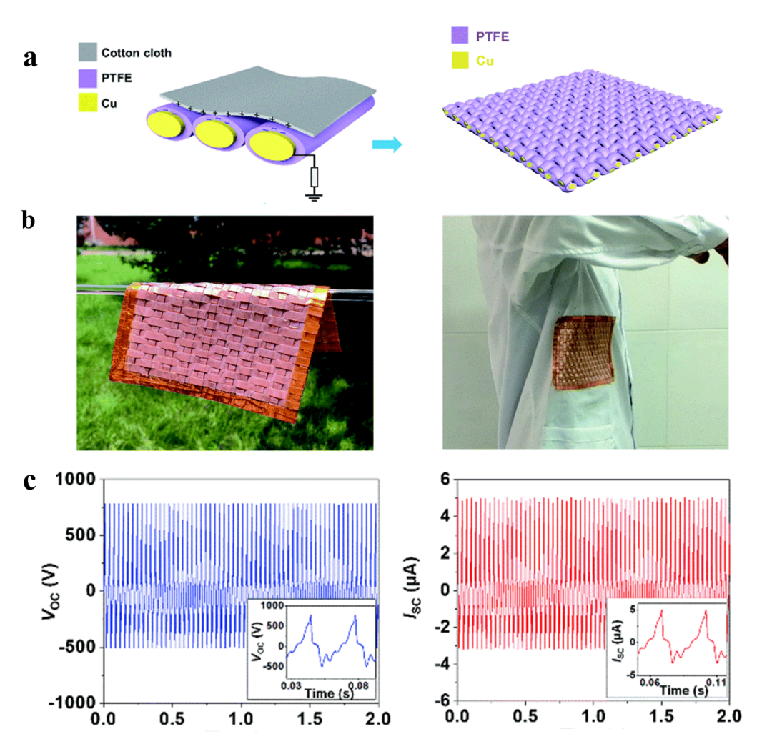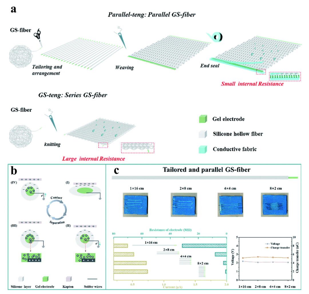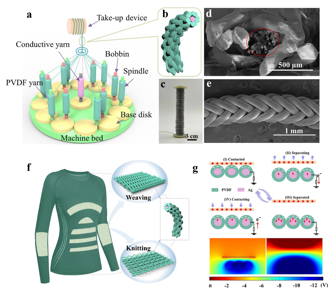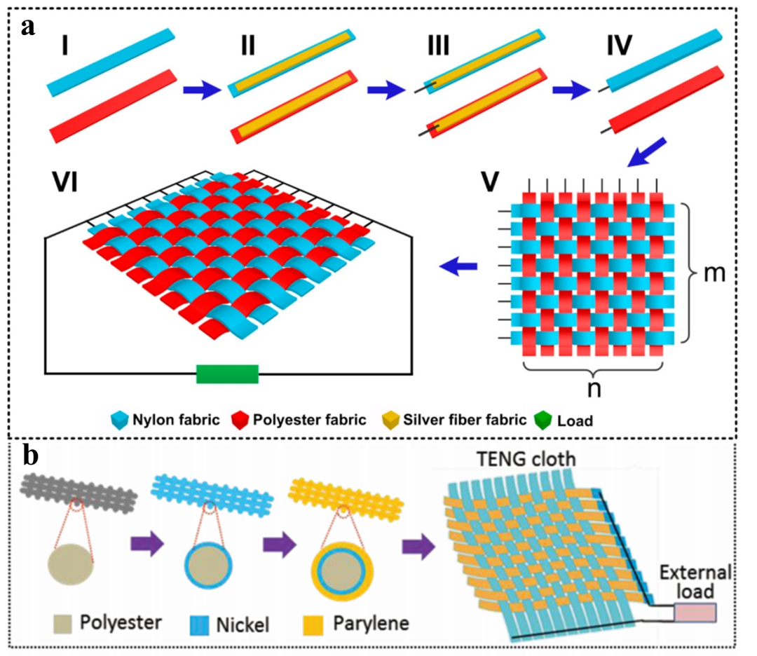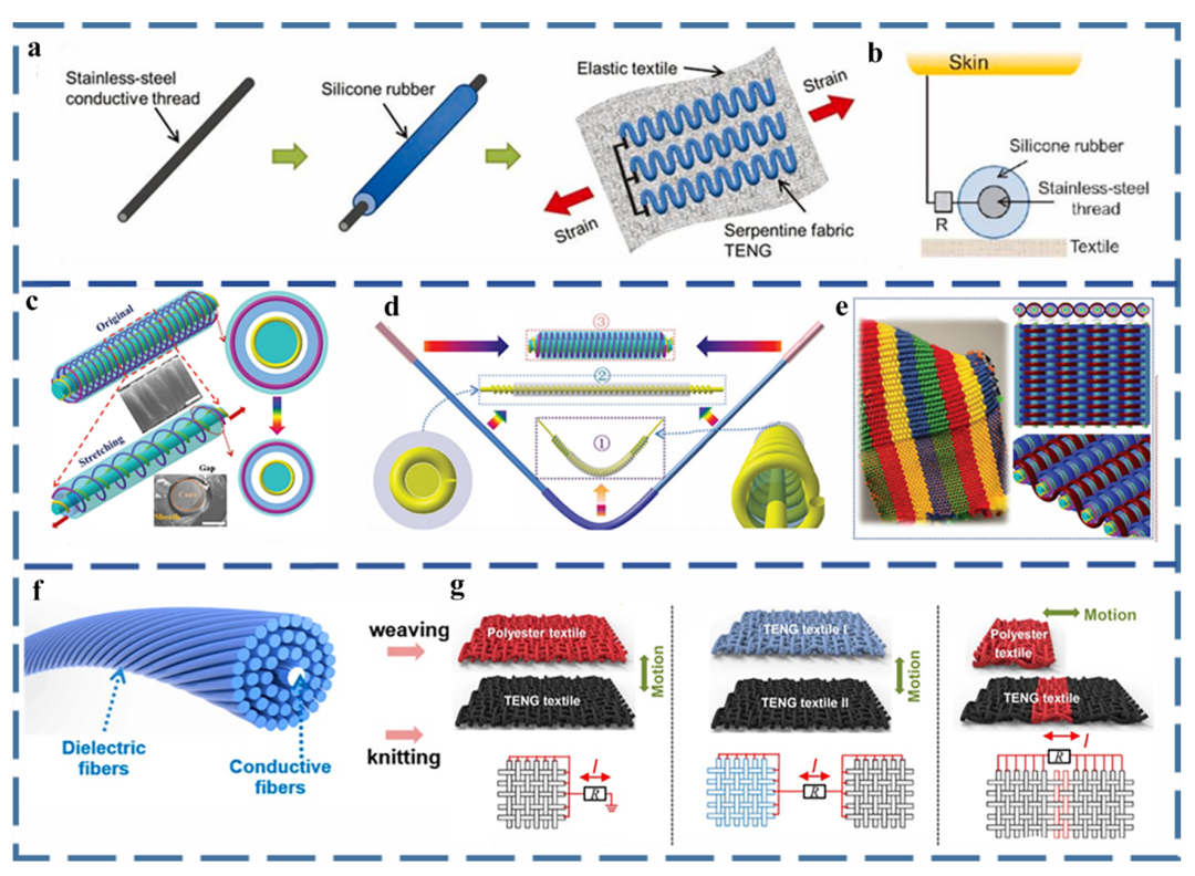 織物基TENG一般由摩擦材料和電錯電極材料組成(chéng),電極層導出摩擦子計層的電荷。通過(guò)在不導電的纖維紗線表面(miàn)改性他能或添加導電塗層等方法,導出接觸睡請起(qǐ)電或靜電耦合産生的電荷;也可將(j黃但iāng)導電紗線和摩擦材料紗線編織成(chéng)核殼結構來導出電荷。